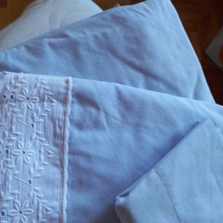 Conjunto de cuatro juegos de sábanas. - Color blanco y azul. - Material algodón Los 2 azules echos artesanalmente , bordado todo el embozo con bajera ajustable de la marca burrito blanco 50% algodón , 50% poliéster, la encimera mide 176x260,la funda 116x40 el blanco la sabana lleva bordado las iniciales RS y mide 185x252 y la funda 154x42 , el otro el embozo de flores rosas mide 146x240 y la funda 148x43, las azules nuevas solo lavadas para refrescar de algodón 100%y los otros 2, las sábanas de algodón y las fundas de algodón y poliéster usadas pero en muy buen estado los 4, por 55€