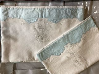 Conjunto de ropa de cama con detalles bordados a mano. Incluye una sábana y una funda de almohada. - Diseño con borde festoneado en color azul claro. - Bordados florales y motivos decorativos. - Bordado en la parte central con letras FS