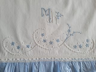 Juego de sábana encimera con precioso bordado en blanco y azul en todo el embozo y volante con puntilla. Medidas 205 X 250 cms. Funda de almohada de 140 x44 cms.