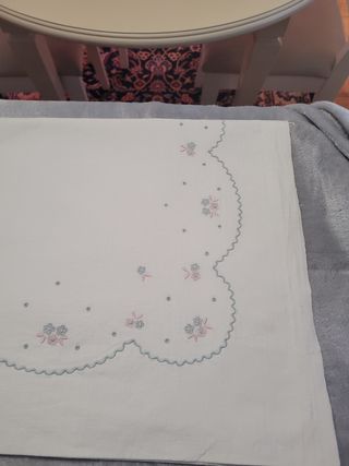 Preciosa sábana antigua de algodón, ideal para decoración o coleccionistas. Es de color blanco con un delicado bordado en azul y rosa. - Bordado a mano - Diseño elegante y clásico - Perfecta para decoración vintage Medidas 176×220cm.