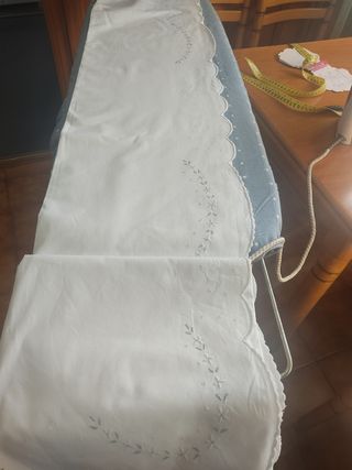 Sabana encimera algodón bordada a mano con gran dibujo central y recorrido largo incluidas las esquinas.Mide de largo 265 cm y de ancho 200 cm, La almohada impecable,sin estrenar, no pertenece pero hace conjunto perfecto, bordado central ,vainicas y en los extremos encaje ancho de bolillos,mide de largo 140 cm, y 46 cm,de ancho.la sabana no lleva iniciales sino dibujo central y la almohada lleva una inicial clara q es la B la principal es interpretable,en principio una A