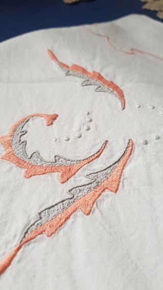 Juego de sábana y almohada de algodón con bordados hechos a mano. Ancho 200 cm. Almohada 140 cm Ver más en mi perfil. Colores salmón, blanco y gris. Bordada a mano. Cama matrimonio, cotton, hilo, rosa, naranja, discretas iniciales CL CJ en hilo blanco. Dormitorio. Zaragoza. Lençol e almofada de algodão. Drap et oreiller en coton.