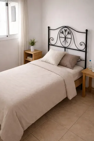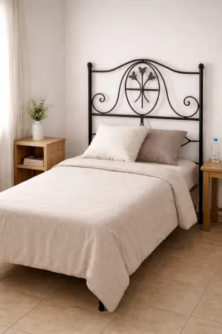 Se vende conjunto de cama con cabecero. Las tres cosas!!!! 1.Estructura del cabecero de metal en negro, con un diseño original y elegante imitación forja. 2.Colchon de 90 3.Somier de 90 Desmontado para la venta, las patas de la cama también se incluyen. *Regalo juegos de sabanas (los de la foto no)