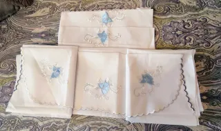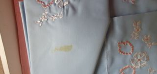 3 juegos de sábanas bordadas con encimera y almohadón para 1,35, tienen marcas de donde estaba la etiqueta, ( las últimas fotos dan ideas de eliminar las marcas ) Yo he probado con alcohol, y se ha ido bastante. Lo siguiente sería lavarla. Ver foto de después. 2 blancas y 1 azul 12 € x unidad 35 € las 3