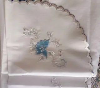 Elegante juego de sábanas con delicados bordados. - Diseño floral en tonos azules y blancos. - Acabado con borde festoneado.