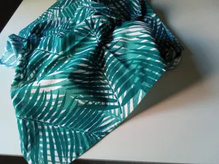 Tela de sábana encimera con estampado tropical de hojas verdes. Se compró para aprovechar la tela en proyectos de costura que finalmente no se llevaron a cabo y por ese motivo se le dio una primera lavada en lavadora para quitar el apresto. Por el estampado tan veraniego quedaria ideal como mantel en una terraza de verano. Con esa intención se compró. Faltaria ajustar las medidas de la tela en funcion de la longitud del tablero de la mesa. La tela tiene unas medidas generosas de 230x260cm aprox. Se compró en una fabrica textil que vendía piezas sueltas. Por eso no lleva etiqueta.