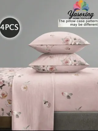 Juego de sábanas de 4 piezas con estampado de flores rosas y hojas verdes, compuesto por: 1 sábana ajustable, 1 sábana plana, 2 fundas de almohada (sin incluir el relleno)152*203 cm 15€ nuevas a estrenar