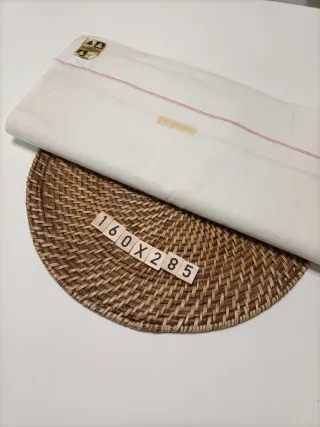 Sábana de lino metis francés con un delicado detalle en color rosa. - Medidas: 160 x 285 cm. - Tejido de alta calidad. Nuevo sin uso Con una marca de la cola de la pegatina que sale con acetona y varios lavados. Este desperfecto está considerado en el precio