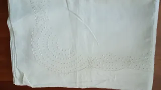 Juego de sábana encimera y funda de almohadón para cama de 105 cm. Presenta un delicado bordado con ojales y un diseño floral. Sábana 180cm de ancho Almohadón135cm Algo amarillenta por el uso pero sin roturas. - Sábana encimera con bordado. - Funda de almohadón a juego.