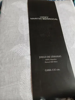 Juego de sábanas de la marca Vicky Martín Berrocal, ideal para cama de 135 cm. El tejido es 100% algodón percal de 180 hilos. - Incluye juego de sábanas y 5 bajeras. - Color gris y blanco con estampado de hojas.