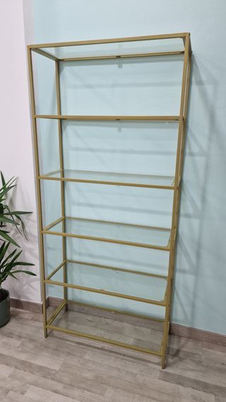 Elegante estantería con estructura metálica dorada y baldas de cristal que estaba en una tienda, se ha usado sólo 3 meses por lo que está prácticamente nueva. - Medidas: 30 cm (profundidad) x 80 cm (ancho) x 177.3 cm (alto). - Diseño moderno y minimalista.
