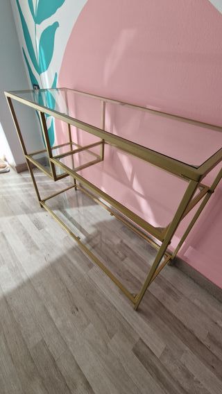 Elegante mesa auxiliar con estructura metálica dorada y superficie de cristal. Usada en tienda solo 3 meses. - Diseño moderno y ligero. - Ideal como mesa de recibidor o auxiliar. - Combina fácilmente con cualquier decoración.