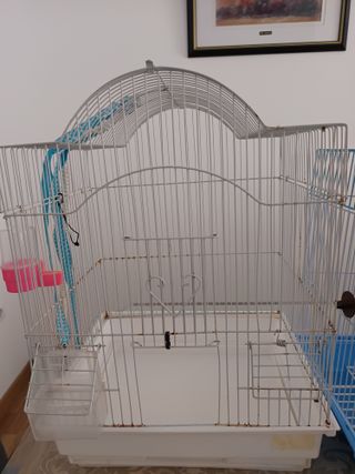 Jaula para pájaros con base azul y estructura blanca. - Bandeja extraíble para facilitar la limpieza. - Incluye accesorios para el interior.