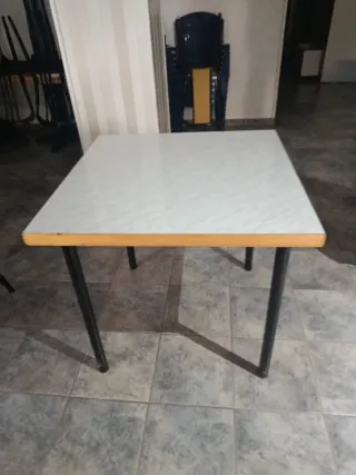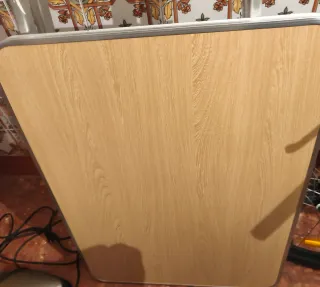 Mesa plegable con un diseño moderno y práctico. Ideal para espacios reducidos o para tener un extra cuando lo necesites. - Acabado imitación madera. - Borde metálico. - Fácil de guardar.
