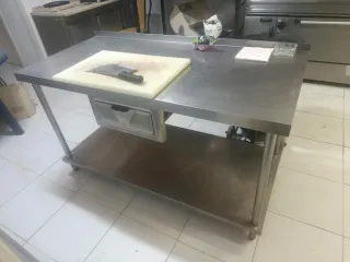 Mesa de trabajo de acero inoxidable, ideal para cocinas profesionales o domésticas. Cuenta con un cajón integrado y una balda inferior para mayor almacenamiento. - Superficie de trabajo amplia. - Cajón extraíble. - Balda inferior. - Estructura robusta.