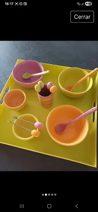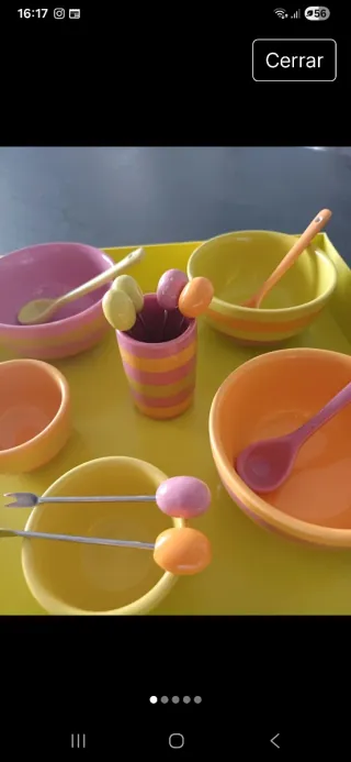 Conjunto de cuencos y accesorios para servir aperitivos. - Piezas de cerámica en tonos naranja, rosa y amarillo. - Incluye cuencos de diferentes tamaños. - Accesorios metálicos con adornos. - Ideal para presentar tapas o postres.