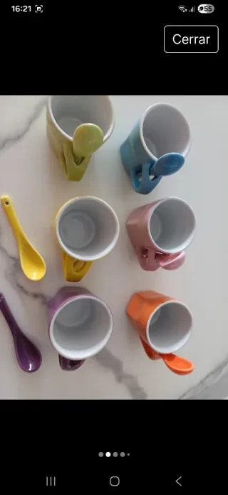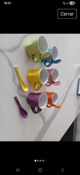 Conjunto de tazas de cerámica con cucharas a juego. Cada taza tiene un color vibrante y un diseño moderno. - Tazas de cerámica. - Incluye cucharas. - Colores variados.