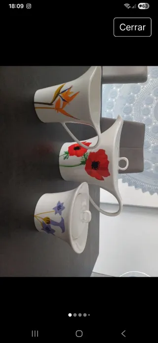 Conjunto de porcelana con tetera, jarrita y azucarero. - Tetera con diseño de amapolas rojas. - Jarrita decorada con flores de ave del paraíso. - Azucarero con motivos florales azules.