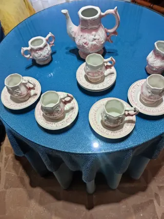 Precioso juego de café vintage con un delicado diseño. - Incluye tetera, tazas y platillos. - Acabado en tonos rosa y blanco. - Fabricado en cerámica y porcelana.Tiene5 tazas y azucarero