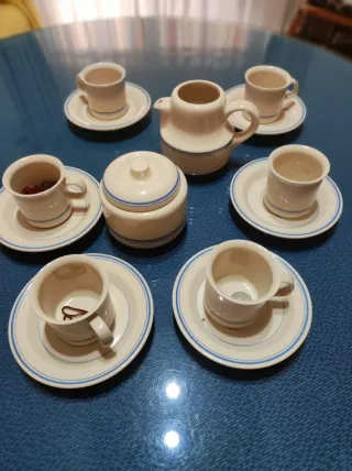 Conjunto de vajilla para café con un diseño clásico. - Incluye tetera, azucarero y varias tazas con sus platos. - Acabado en cerámica con detalles en azul.