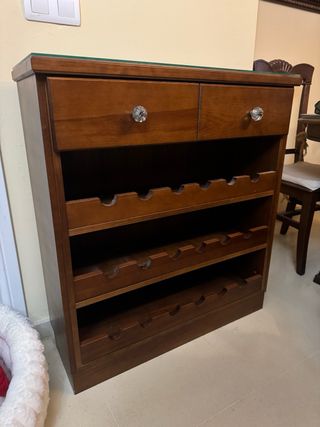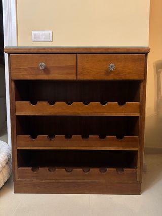 Vendo mueble botellero de madera en muy buen estado. Dispone de capacidad para varias botellas distribuidas en 3 estantes, además de 2 cajones superiores ideales para guardar accesorios o utensilios. Diseño clásico y elegante, robusto y estable, perfecto para cocina, comedor, bodega o salón. Color madera cálida que combina fácilmente con distintos estilos. Recogida en mano