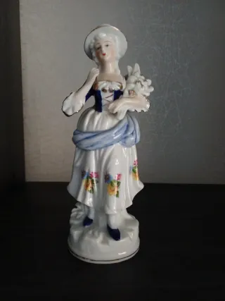 Preciosas figuras de porcelana que representan a una pareja. - Diseño clásico con detalles en azul y blanco. - Adornadas con motivos florales. - Base con borde dorado. - 20cm de alto