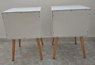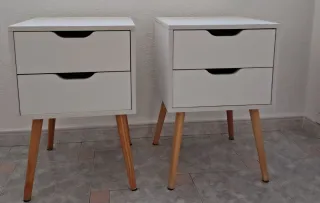 Conjunto de dos mesitas de noche de estilo nórdico. Su diseño moderno y funcional aportará un toque especial a tu habitación. - Dos cajones cada una ,con hueco para abrirlas. - Acabado en blanco. - Patas cónicas de madera. En perfecto estado como se ve en las fotos , solo tiene alguna señal en cajón. Medidas: 82 x 40 x 40 cm 🍁NOTA: 👉No sé admite devolución una vez visto y comprado. 👉Solo pago en efectivo