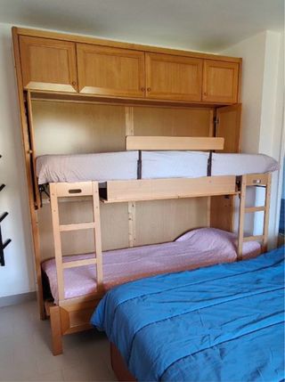 Práctica cama litera abatible horizontal, ideal para optimizar el espacio. Fabricada en madera. Tiene forma de un armario con almacenamiento por la parte de arriba. - Estructura de madera resistente. Se encuentra en Salobreña. No se hace el envio.