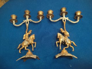 Elegante pareja de candelabros con figuras de jinetes a caballo. Cada uno tiene capacidad para tres velas. - Diseño detallado de jinetes. - Soporte para tres velas por candelabro. - Base ornamentada.