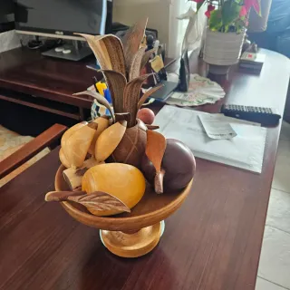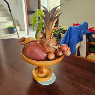 Bonita pieza decorativa de madera con forma de frutas. - Base de madera. - Frutas de madera tallada. - Diseño tropical. Tallado a mano por artesanos de Venezuela
