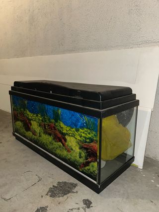 Pecera en perfecto estado, lista para usar. Incluye filtro. - Diseño moderno y atractivo. - Fondo decorativo con paisaje acuático.