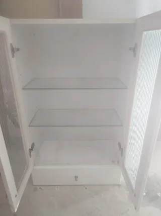 Mueble de baño con un diseño moderno y funcional. Sus puertas de cristal permiten ver el interior. Son dos unidades - Acabado en color blanco. - Puertas con detalles de cristal. - Cajón inferior para almacenamiento adicional.