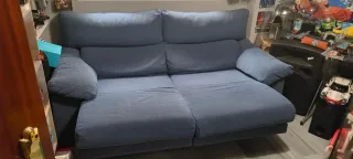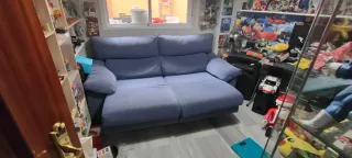 Sofá de tela de 195cm de largo. Su diseño moderno se adapta a cualquier estancia. Se habré y se queda en 130cm y cabezeros regulable - Tapicería de tela. - Color azul y gris.