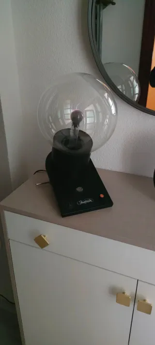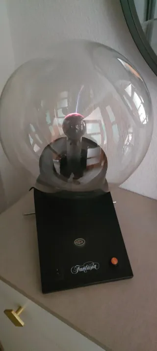 Lámpara de plasma de la marca Fantasia, con una base negra y una esfera de cristal transparente. - Diseño moderno y llamativo. - Ideal como elemento decorativo. Es grande y va al son de la música y por la vibración