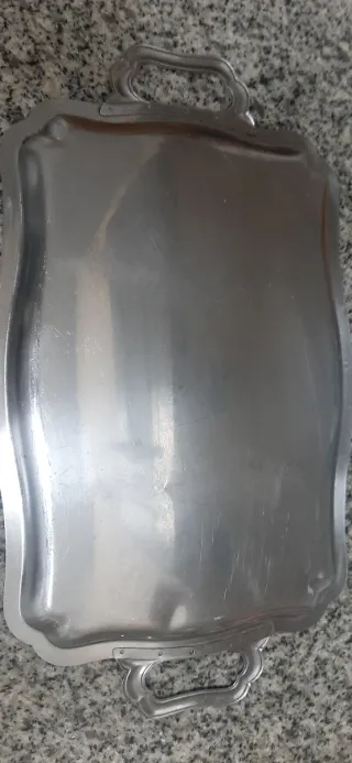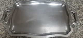 Elegante bandeja de latón con un diseño clásico y dos asas. - Material: Latón - Color: Plateado - Con asas laterales para facilitar el transporte. Medidas sin medir las asas