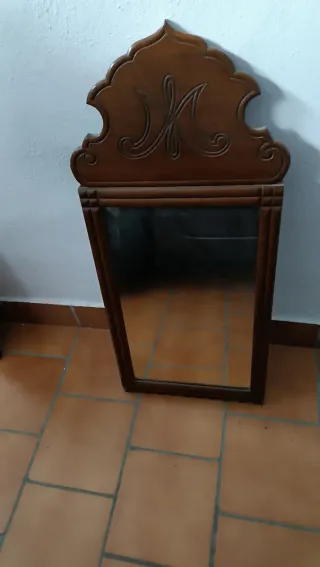 Elegante espejo grande con marco de madera de roble tallado. Su diseño clásico y los detalles ornamentales en la parte superior le dan un toque distintivo. Marco de madera 114 cm x 48 cm. Espejo 89 cm x 43 cm. - Marco de madera tallada. - Diseño ornamental superior.