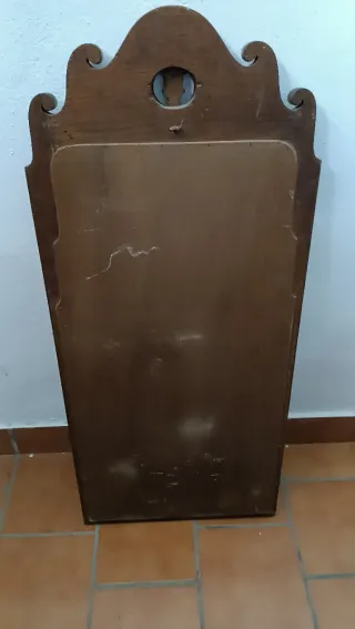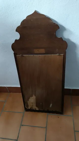 Elegante espejo antiguo con marco de madera de roble. Marco de madera 94 cm x 41 cm. Espejo 56 cm x 33 cm. - Diseño clásico con detalles tallados. - Marco con acabado en madera oscura.