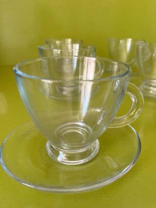 Elegante juego de seis tazas de café con sus platillos a juego. SIN ESTRENAR. - Fabricadas en cristal transparente. - Diseño clásico y funcional. - Ideales para disfrutar de tu café o té. ENTREGA EN GRANADA O EN SALOBREÑA.