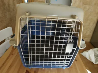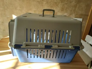 Transportín para mascotas con diseño ventilado. - Parte superior en color beige. - Base en color azul. - Asa superior para facilitar el transporte.