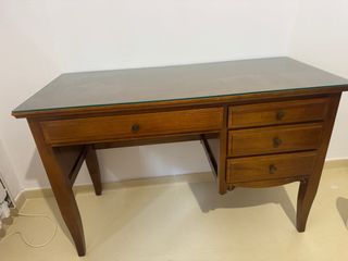Elegante escritorio de madera con una superficie de cristal. - Cajón principal. - Tres cajones laterales apilados. - Patas curvas de madera. Vendo escritorio con su silla en buen estado. Ideal para estudio o teletrabajo. El escritorio es amplio y cómodo, y la silla es resistente y funcional. Se vende el conjunto completo.