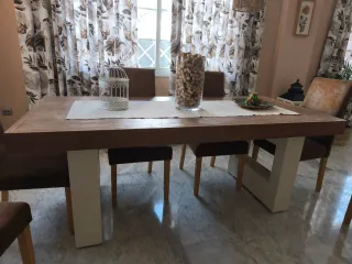 Mesa de comedor o de trabajo con un diseño clásico y robusto. Sus dimensiones la hacen ideal para reuniones familiares o para tener un amplio espacio de trabajo. - Fabricada en madera maciza. - Medidas: 185 cm de largo, 90 cm de ancho y 77 cm de alto.