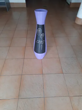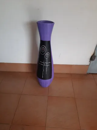 Elegante jarrón de color púrpura con un llamativo diseño en negro y blanco. - Forma alta y estilizada. - Detalle de espirales y líneas en la parte central.
