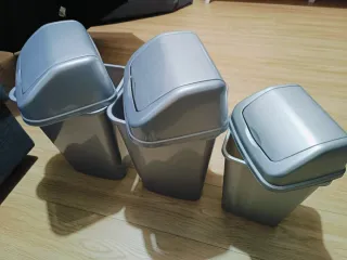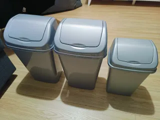Conjunto de tres papeleras de plástico en color gris. Diseñadas con una tapa abatible para facilitar su uso. - Papelera mediana 15L x 2 - Papelera pequeña 10L