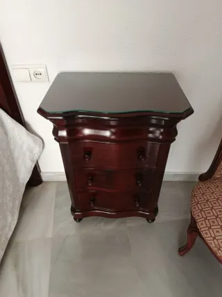 Elegante juego de dos mesitas de noche con un diseño clásico y refinado. - Acabado en madera oscura. - Encimera de cristal. - Cajones con tiradores decorativos.