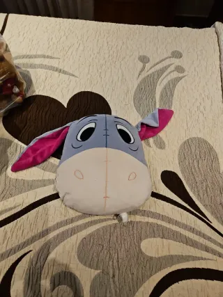 Este cojín tiene la forma de la cara de Eeyore, el burro de Winnie the Pooh. Es suave y agradable al tacto. - Diseño de Eeyore. - Colores gris y rosa.