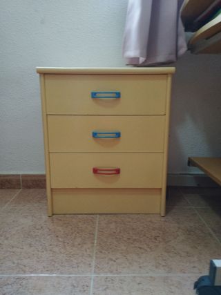 Mueble de cajones con un diseño moderno y funcional. - Cajones con tiradores de plástico en colores azul y rojo. - Estructura principal de madera en tono beige.