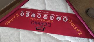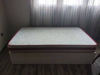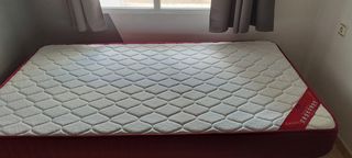 Base tapizada y colchón de 105x 190, el colchón solo se ha usado 4 meses, siempre con su funda, es el modelo zafiro de Amazon. La base está muy bien, pero al cogerla se rompió la tela abajo, por lo demás está estupendo. El conjunto se encuentra en Guardamar. El colchón tiene 21 cm de altura.