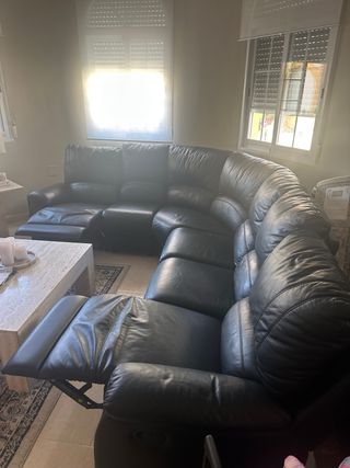 Sofá modular de piel en color negro. Esquinero con chaise longue y asientos reclinables. - Tapicería de piel. - Diseño modular. - Asientos reclinables.