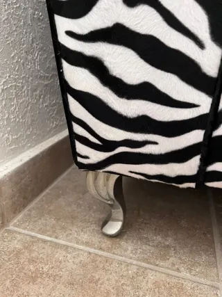 Sofá de tela con un llamativo estampado de cebra en blanco y negro. Su diseño moderno y atrevido lo convierte en una pieza única para cualquier espacio. - Tapicería de tela. - Patas metálicas plateadas. Mandado a hacer a medida y traído desde Reino unido. Usado en una oficina, como nuevo.
