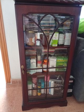 Vitrina de madera con puertas de cristal, ideal para exhibir objetos. - Diseño elegante con detalles curvos en el cristal. - Estantes interiores para organización. - Tirador dorado en la puerta.